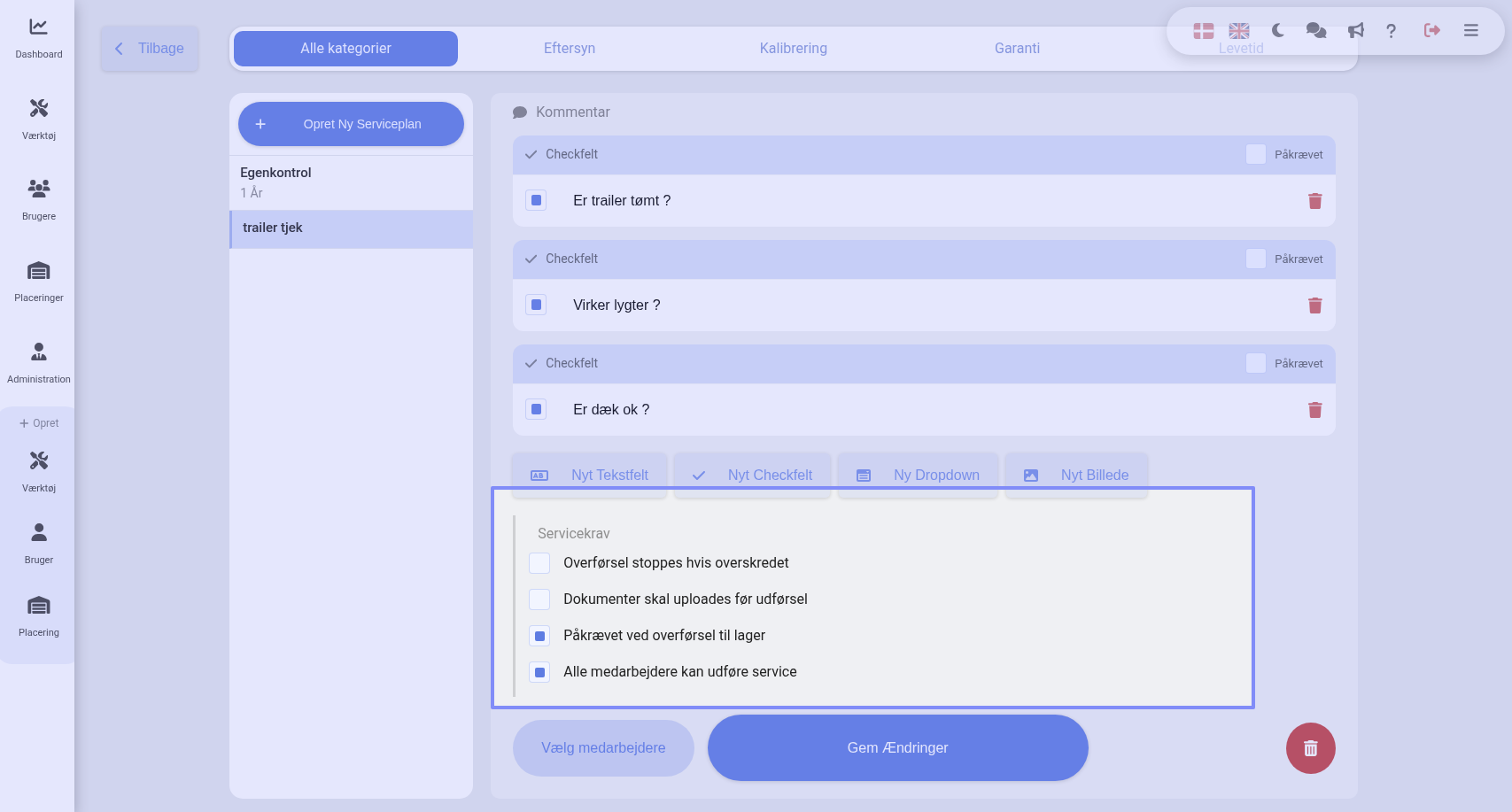 Jeg mangler en mulighed for at kunne tilrettelægge det sådan at når mine folk overlevere traileren til mig (administrator) så er det påkrævet at de gennemgår den checkliste jeg har vedhæftet kategorien “trailer”